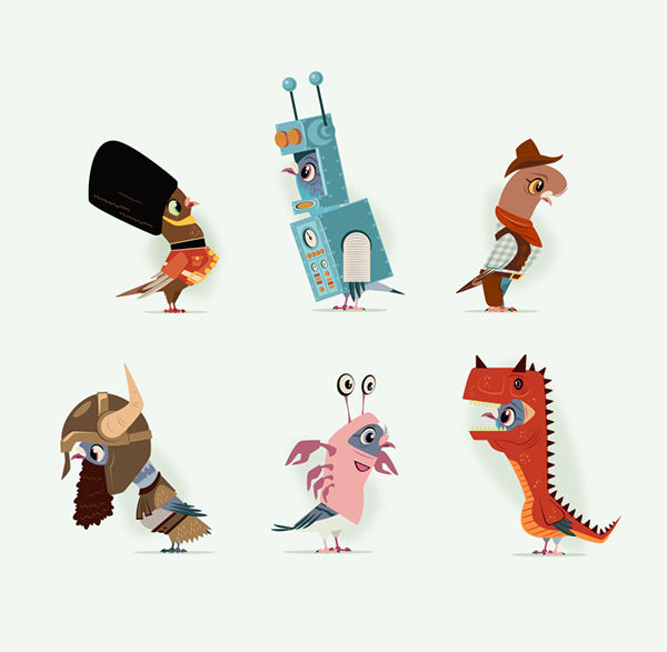 Rayner Alencar is a Brazilian illustrator who currently resides in Australia (at least according to his website's telephone country code... go stalker me). Unlike James Gilleard, who mostly designs (or re-designs) characters for branding campaigns, Alancar specialises in character design. As such, his characters are more vulnerable. You can almost immediately discern the man on the left's personality, from the way his coat flies behind him, or his confident gait, or the arch in his eyebrows. And that is what I want to take from Alencar---his expressiveness, and the way he uses body gestures and comedic facial expressions to convey personalities.